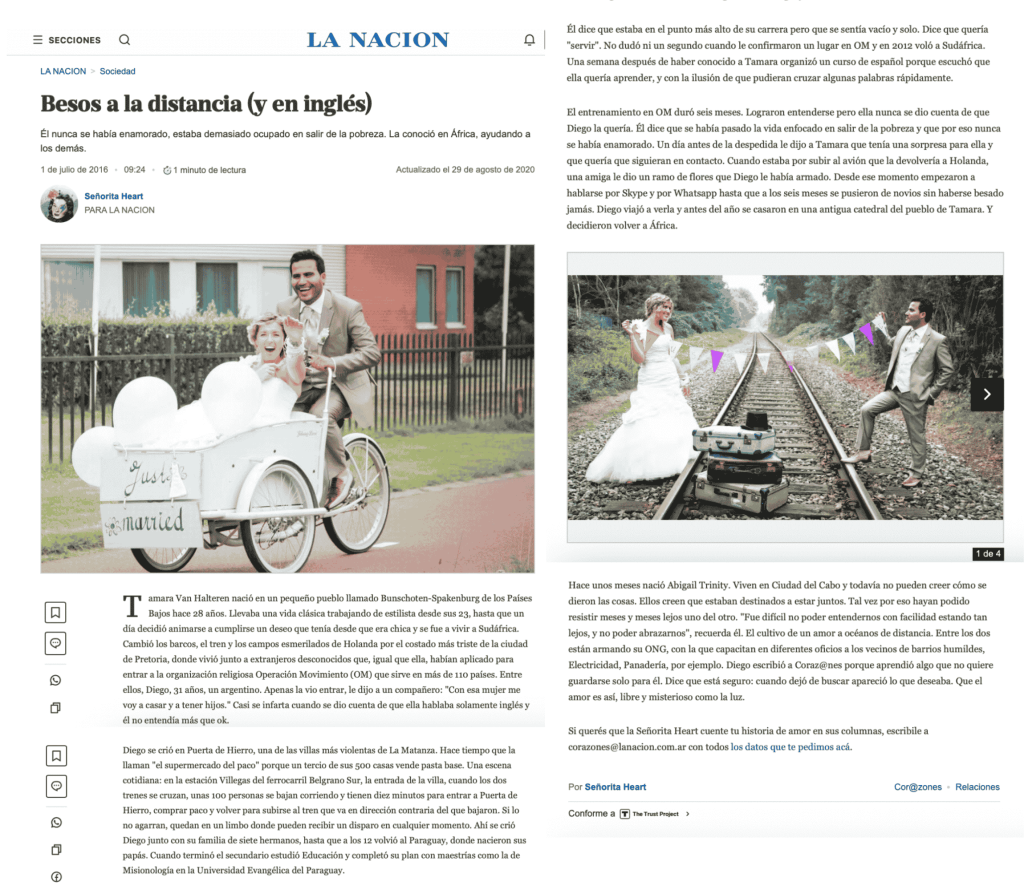 El entrenamiento en OM duró seis meses. Lograron entenderse pero ella nunca se dio cuenta de que Diego la quería. Él dice que se había pasado la vida enfocado en salir de la pobreza y que por eso nunca se había enamorado. Un día antes de la despedida le dijo a Tamara que tenía una sorpresa para ella y que quería que siguieran en contacto. Cuando estaba por subir al avión que la devolvería a Holanda, una amiga le dio un ramo de flores que Diego le había armado. Desde ese momento empezaron a hablarse por Skype y por Whatsapp hasta que a los seis meses se pusieron de novios sin haberse besado jamás. Diego viajó a verla y antes del año se casaron en una antigua catedral del pueblo de Tamara. Y decidieron volver a África.
